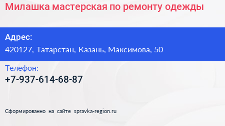 Милашка, мастерская по ремонту одежды по адресу 420127, Татарстан, Казань, Максимова, 50 в дальнейшем Организация, размещена в следующих категориях: