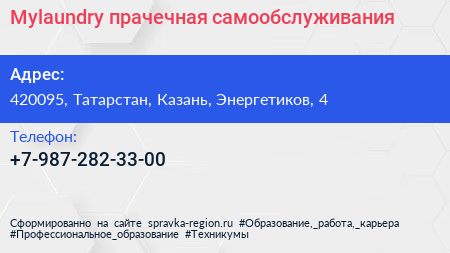 Mylaundry, прачечная самообслуживания по адресу 420095, Татарстан, Казань, Энергетиков, 4 в дальнейшем Организация, размещена в следующих категориях: