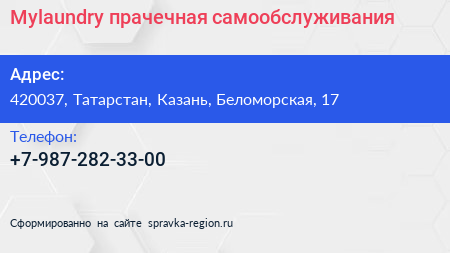 Mylaundry, прачечная самообслуживания по адресу 420037, Татарстан, Казань, Беломорская, 17 в дальнейшем Организация, размещена в следующих категориях: