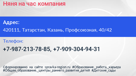 Няня на час, компания по адресу 420111, Татарстан, Казань, Профсоюзная, 40/42 в дальнейшем Организация, размещена в следующих категориях: