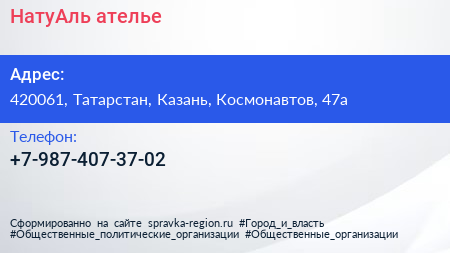НатуАль, ателье по адресу 420061, Татарстан, Казань, Космонавтов, 47а в дальнейшем Организация, размещена в следующих категориях: