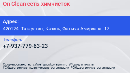 On Clean, сеть химчисток по адресу 420124, Татарстан, Казань, Фатыха Амирхана, 17 в дальнейшем Организация, размещена в следующих категориях: