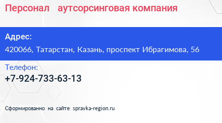 Персонал +, аутсорсинговая компания по адресу 420066, Татарстан, Казань, проспект Ибрагимова, 56 в дальнейшем Организация, размещена в следующих категориях: