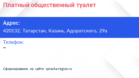 Платный общественный туалет по адресу 420132, Татарстан, Казань, Адоратского, 29а в дальнейшем Организация, размещена в следующих категориях: