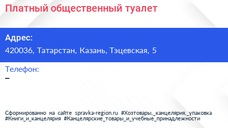 Платный общественный туалет по адресу 420036, Татарстан, Казань, Тэцевская, 5 в дальнейшем Организация, размещена в следующих категориях: