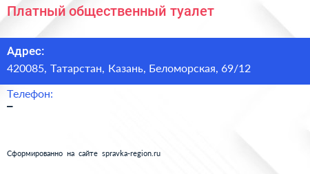 Платный общественный туалет по адресу 420085, Татарстан, Казань, Беломорская, 69/12 в дальнейшем Организация, размещена в следующих категориях: