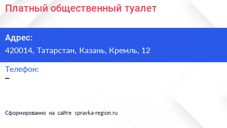 Платный общественный туалет по адресу 420014, Татарстан, Казань, Кремль, 12 в дальнейшем Организация, размещена в следующих категориях: