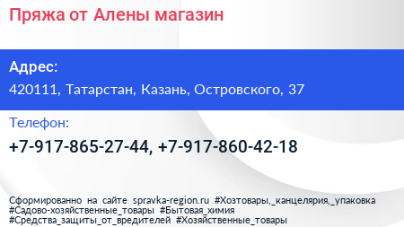 Пряжа от Алены, магазин по адресу 420111, Татарстан, Казань, Островского, 37 в дальнейшем Организация, размещена в следующих категориях: