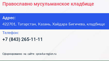 Православно-мусульманское кладбище по адресу 422701, Татарстан, Казань, Хайдара Бигичева, кладбище в дальнейшем Организация, размещена в следующих категориях: