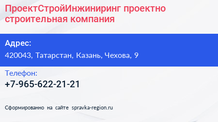ПроектСтройИнжиниринг, проектно-строительная компания по адресу 420043, Татарстан, Казань, Чехова, 9 в дальнейшем Организация, размещена в следующих категориях: