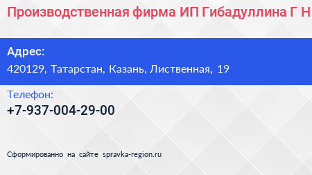Производственная фирма, ИП Гибадуллина Г.Н. по адресу 420129, Татарстан, Казань, Лиственная, 19 в дальнейшем Организация, размещена в следующих категориях: