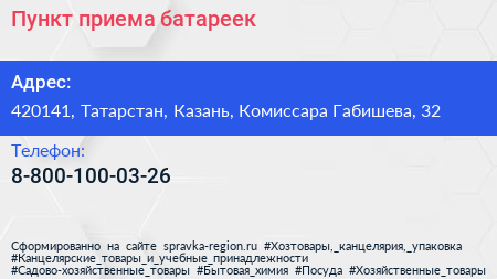 Пункт приема батареек по адресу 420141, Татарстан, Казань, Комиссара Габишева, 32 в дальнейшем Организация, размещена в следующих категориях: