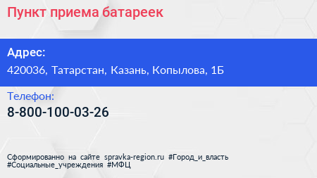 Пункт приема батареек по адресу 420036, Татарстан, Казань, Копылова, 1Б в дальнейшем Организация, размещена в следующих категориях: