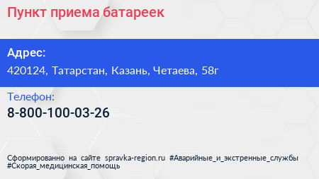 Пункт приема батареек по адресу 420124, Татарстан, Казань, Четаева, 58г в дальнейшем Организация, размещена в следующих категориях: