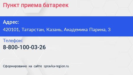 Пункт приема батареек по адресу 420101, Татарстан, Казань, Академика Парина, 3 в дальнейшем Организация, размещена в следующих категориях: