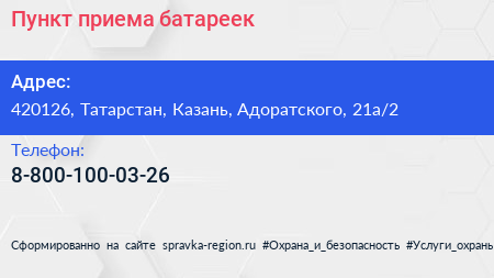 Пункт приема батареек по адресу 420126, Татарстан, Казань, Адоратского, 21а/2 в дальнейшем Организация, размещена в следующих категориях: