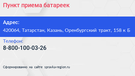 Пункт приема батареек по адресу 420064, Татарстан, Казань, Оренбургский тракт, 158 к Б в дальнейшем Организация, размещена в следующих категориях: