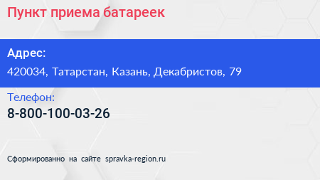 Пункт приема батареек по адресу 420034, Татарстан, Казань, Декабристов, 79 в дальнейшем Организация, размещена в следующих категориях: