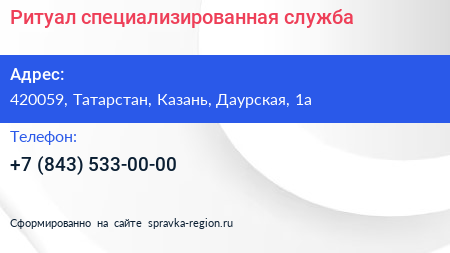 Ритуал, специализированная служба по адресу 420059, Татарстан, Казань, Даурская, 1а в дальнейшем Организация, размещена в следующих категориях: