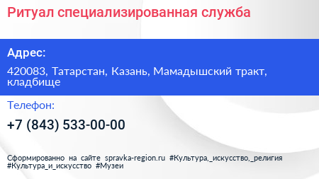 Ритуал, специализированная служба по адресу 420083, Татарстан, Казань, Мамадышский тракт, кладбище в дальнейшем Организация, размещена в следующих категориях: