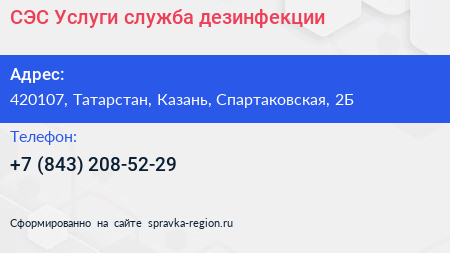 СЭС Услуги, служба дезинфекции по адресу 420107, Татарстан, Казань, Спартаковская, 2Б в дальнейшем Организация, размещена в следующих категориях: