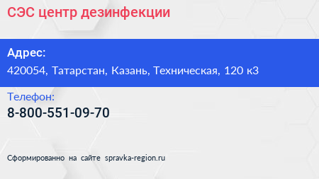 СЭС, центр дезинфекции по адресу 420054, Татарстан, Казань, Техническая, 120 к3 в дальнейшем Организация, размещена в следующих категориях:
