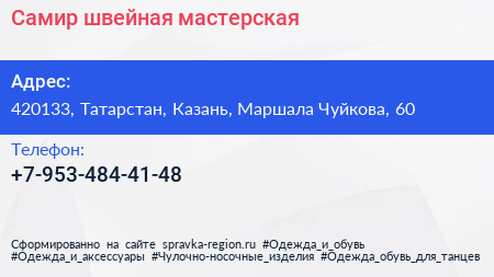 Самир, швейная мастерская по адресу 420133, Татарстан, Казань, Маршала Чуйкова, 60 в дальнейшем Организация, размещена в следующих категориях: