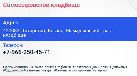 Самосыровское кладбище по адресу 420083, Татарстан, Казань, Мамадышский тракт, кладбище в дальнейшем Организация, размещена в следующих категориях: