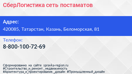 СберЛогистика, сеть постаматов по адресу 420085, Татарстан, Казань, Беломорская, 81 в дальнейшем Организация, размещена в следующих категориях:
