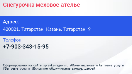 Снегурочка, меховое ателье по адресу 420021, Татарстан, Казань, Татарстан, 9 в дальнейшем Организация, размещена в следующих категориях: