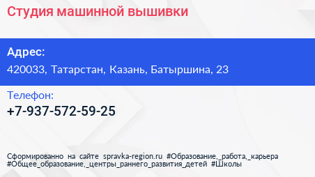 Студия машинной вышивки по адресу 420033, Татарстан, Казань, Батыршина, 23 в дальнейшем Организация, размещена в следующих категориях: