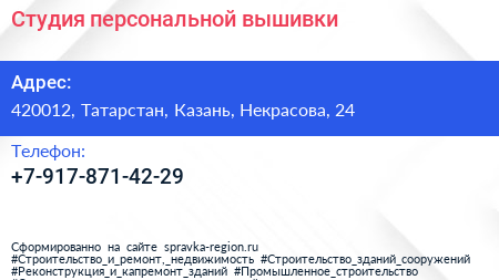 Студия персональной вышивки по адресу 420012, Татарстан, Казань, Некрасова, 24 в дальнейшем Организация, размещена в следующих категориях:
