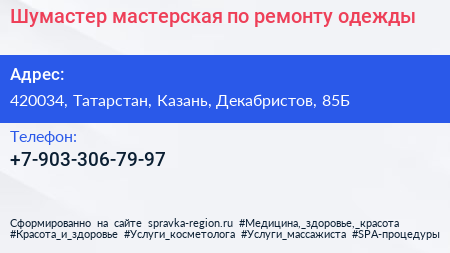Шумастер, мастерская по ремонту одежды по адресу 420034, Татарстан, Казань, Декабристов, 85Б в дальнейшем Организация, размещена в следующих категориях: