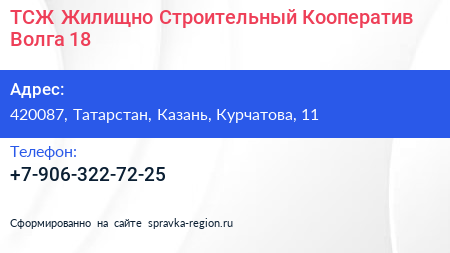 ТСЖ Жилищно-Строительный Кооператив Волга 18 по адресу 420087, Татарстан, Казань, Курчатова, 11 в дальнейшем Организация, размещена в следующих категориях: