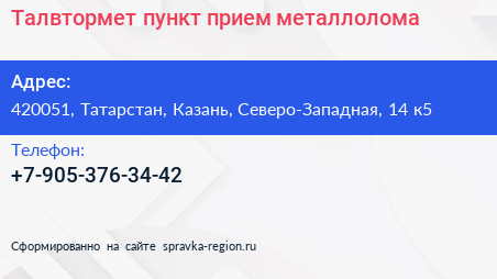 Талвтормет, пункт прием металлолома по адресу 420051, Татарстан, Казань, Северо-Западная, 14 к5 в дальнейшем Организация, размещена в следующих категориях:
