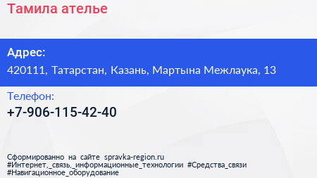 Тамила, ателье по адресу 420111, Татарстан, Казань, Мартына Межлаука, 13 в дальнейшем Организация, размещена в следующих категориях: