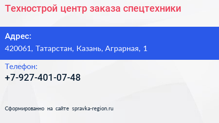 Технострой, центр заказа спецтехники по адресу 420061, Татарстан, Казань, Аграрная, 1 в дальнейшем Организация, размещена в следующих категориях: