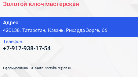 Золотой ключ, мастерская по адресу 420138, Татарстан, Казань, Рихарда Зорге, 66 в дальнейшем Организация, размещена в следующих категориях: