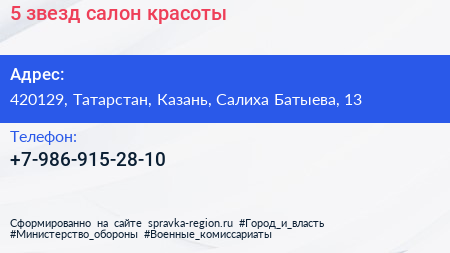 5 звезд, салон красоты по адресу 420129, Татарстан, Казань, Салиха Батыева, 13 в дальнейшем Организация, размещена в следующих категориях: