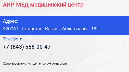 АИР МЕД, медицинский центр по адресу 420061, Татарстан, Казань, Абжалилова, 19а в дальнейшем Организация, размещена в следующих категориях: