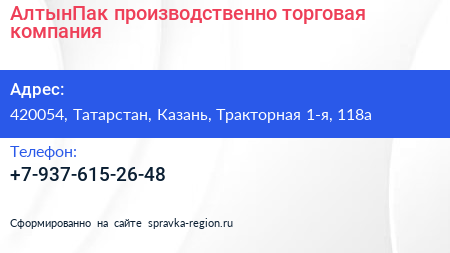АлтынПак, производственно-торговая компания по адресу 420054, Татарстан, Казань, Тракторная 1-я, 118а в дальнейшем Организация, размещена в следующих категориях: