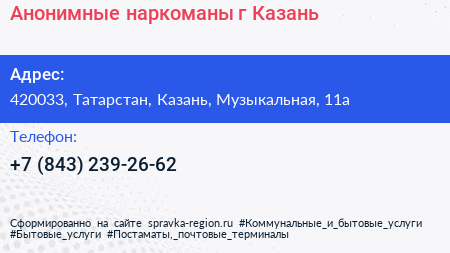 Анонимные наркоманы, г. Казань по адресу 420033, Татарстан, Казань, Музыкальная, 11а в дальнейшем Организация, размещена в следующих категориях: