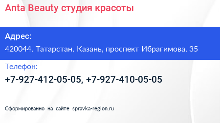 Anta Beauty, студия красоты по адресу 420044, Татарстан, Казань, проспект Ибрагимова, 35 в дальнейшем Организация, размещена в следующих категориях: