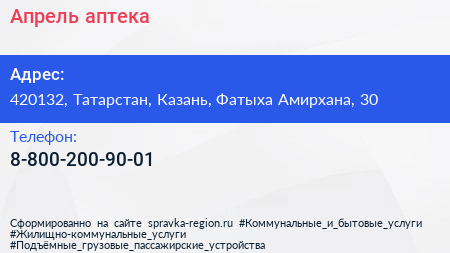 Апрель, аптека по адресу 420132, Татарстан, Казань, Фатыха Амирхана, 30 в дальнейшем Организация, размещена в следующих категориях: