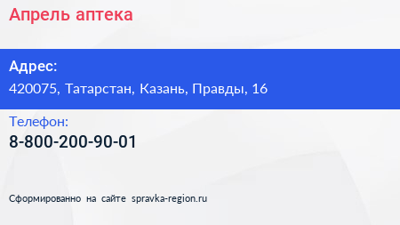 Апрель, аптека по адресу 420075, Татарстан, Казань, Правды, 16 в дальнейшем Организация, размещена в следующих категориях: