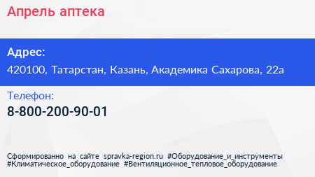 Апрель, аптека по адресу 420100, Татарстан, Казань, Академика Сахарова, 22а в дальнейшем Организация, размещена в следующих категориях: