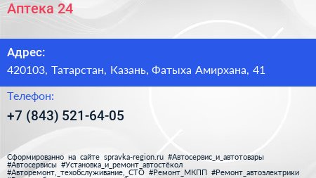 Аптека 24+ по адресу 420103, Татарстан, Казань, Фатыха Амирхана, 41 в дальнейшем Организация, размещена в следующих категориях: