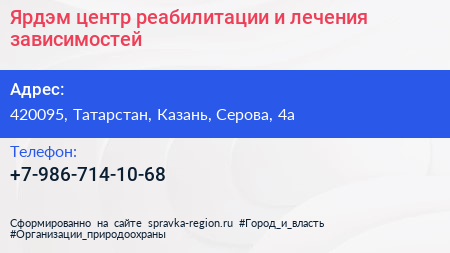 Ярдэм, центр реабилитации и лечения зависимостей по адресу 420095, Татарстан, Казань, Серова, 4а в дальнейшем Организация, размещена в следующих категориях: