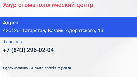 Азур, стоматологический центр по адресу 420126, Татарстан, Казань, Адоратского, 13 в дальнейшем Организация, размещена в следующих категориях: