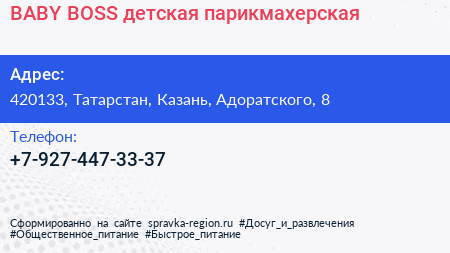 BABY BOSS, детская парикмахерская по адресу 420133, Татарстан, Казань, Адоратского, 8 в дальнейшем Организация, размещена в следующих категориях: